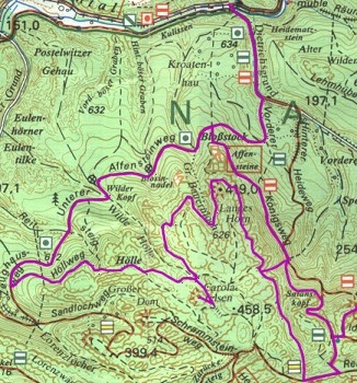 Nun geht es den gleichen Weg wieder hinunter, unten wieder links 100m zurück bis zur Weggabelung. Hier zweigen wir zur Wilden Hölle in den Oberen Affensteinweg ab.