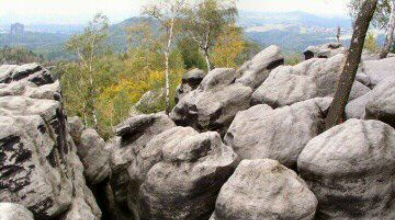 Wieder zurück auf dem Weg, hält man sich an der 300m später folgenden Weggabelung rechts, steigt 100m weiter die Stufen hinauf und biegt dann rechts ab in den, mit Metallstufen gesicherten, Anstieg (30 Höhenmeter) zum Caralofelsen. Auf dem Felsplateau (das sehr zerklüftet ist) sollte man sich eine längere Rast gönnen und das phantastische Panorama auf die Schrammsteine, Falkenstein, Lilienstein, Grossen Dom und viele andere geniessen.