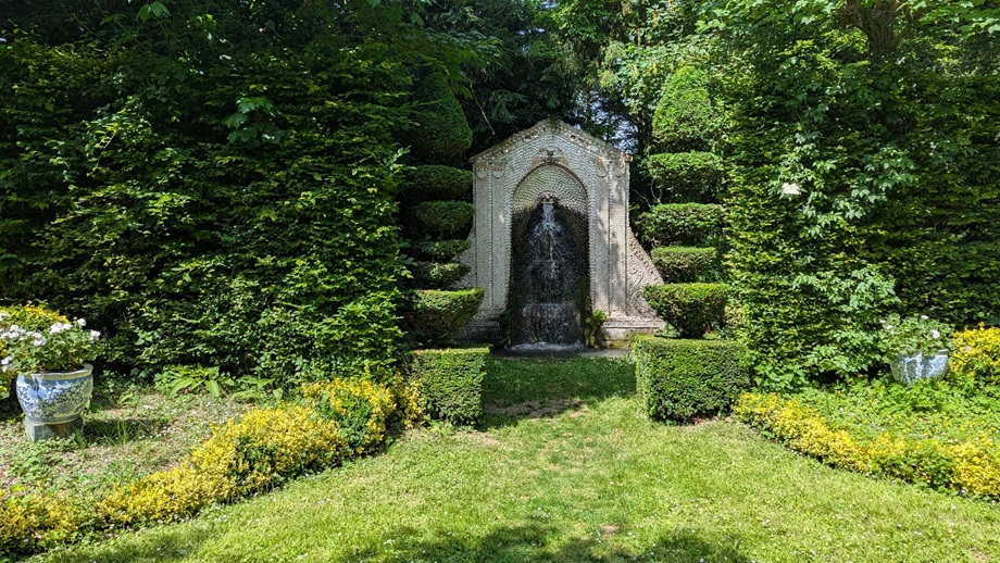 Wasser ist im Garten in verschwenderischer und überbordenten Weise eingesetzt. Überraschend sprudelt es aus allen Richtungen